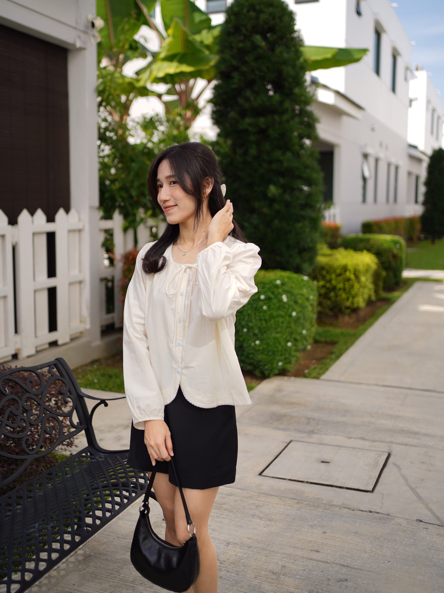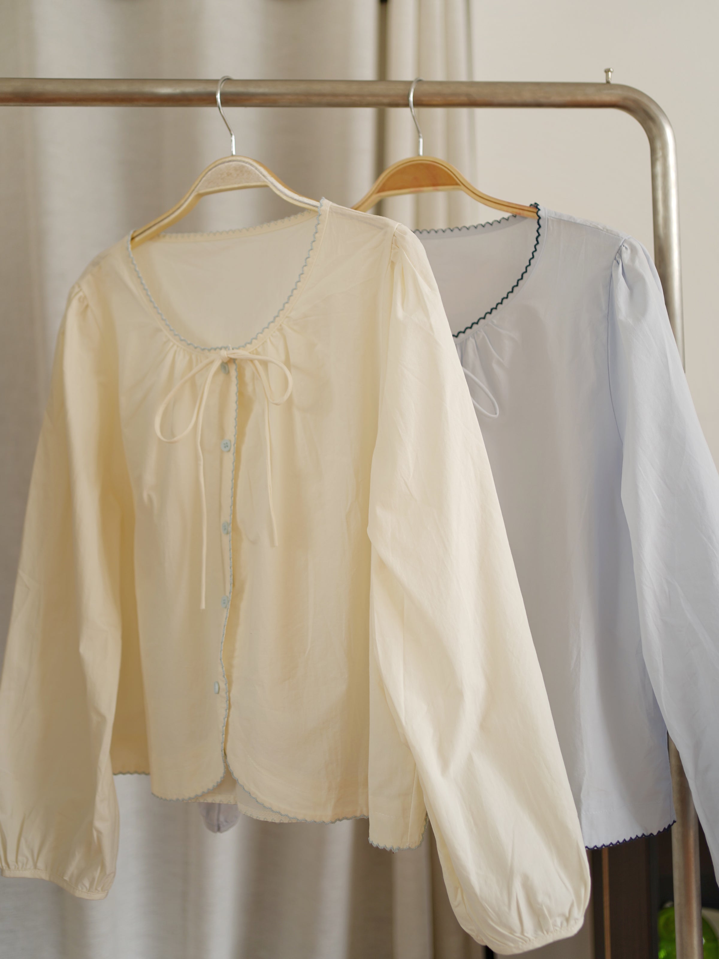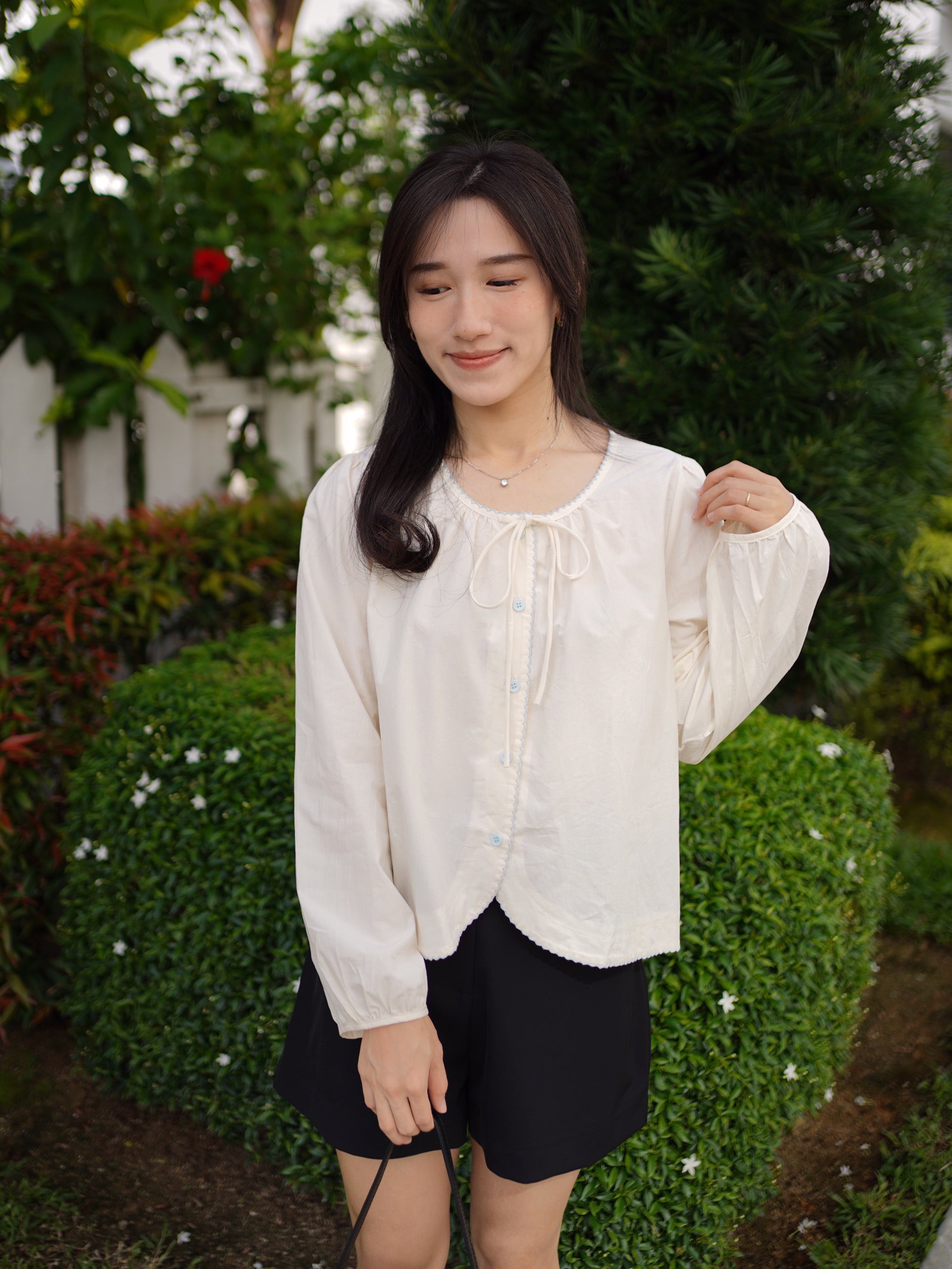 This long-sleeve blouse with ribbon tie neckline is soft, romantic, and irresistibly chic. Featuring delicate button details and airy fabric, it adds a daring hint of elegance while keeping the look sweet and feminine. Perfect for effortless day-to-night styling with a light, graceful charm.