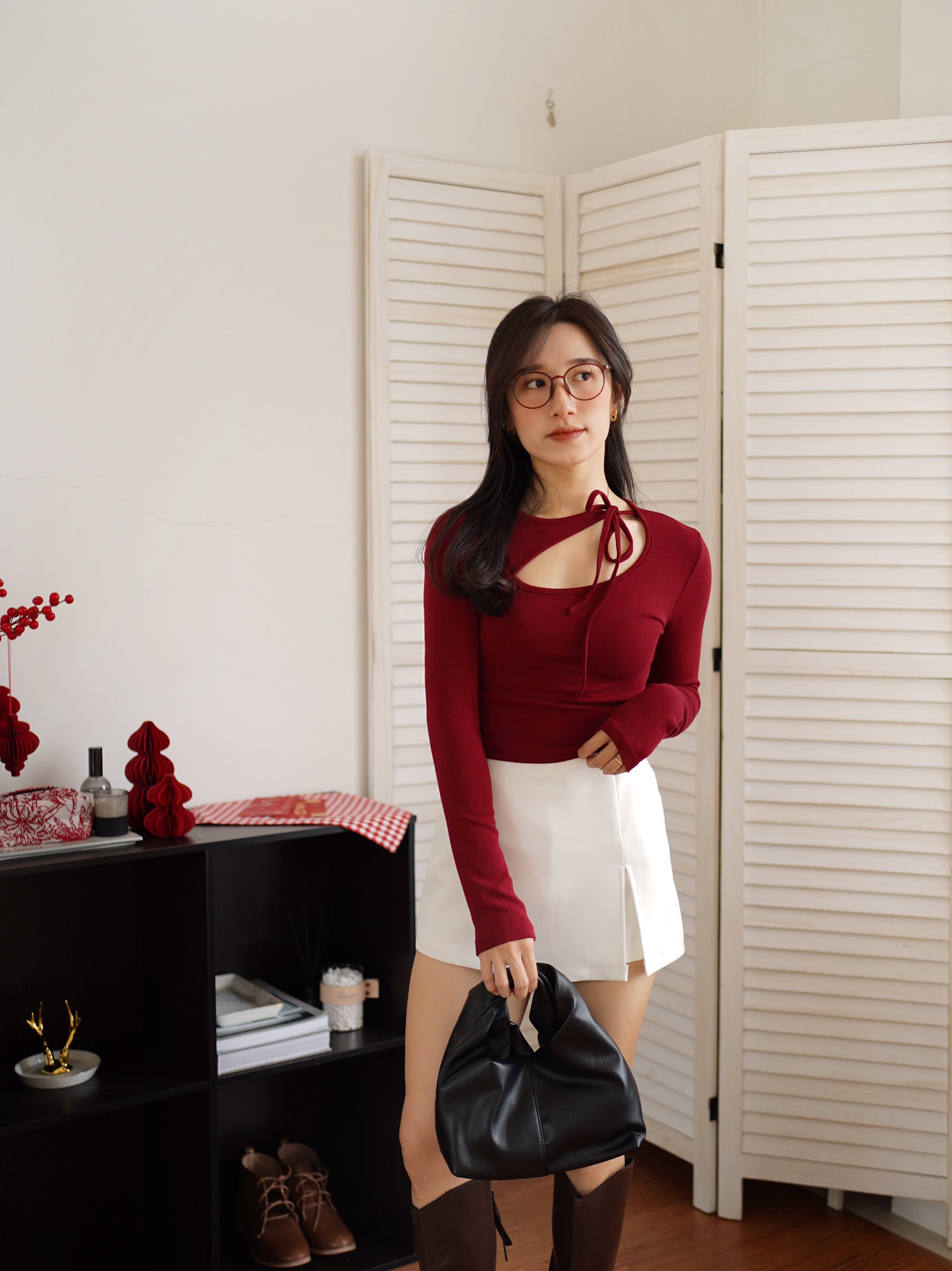This asymmetrical long-sleeve cut-out top with tie-neck detail is sleek, flattering, and effortlessly stylish. Designed to accentuate the neckline with a subtle peek of skin, it hugs the body perfectly for a modern, feminine silhouette. Ideal for chic day looks or elevated evenings with a confident edge.