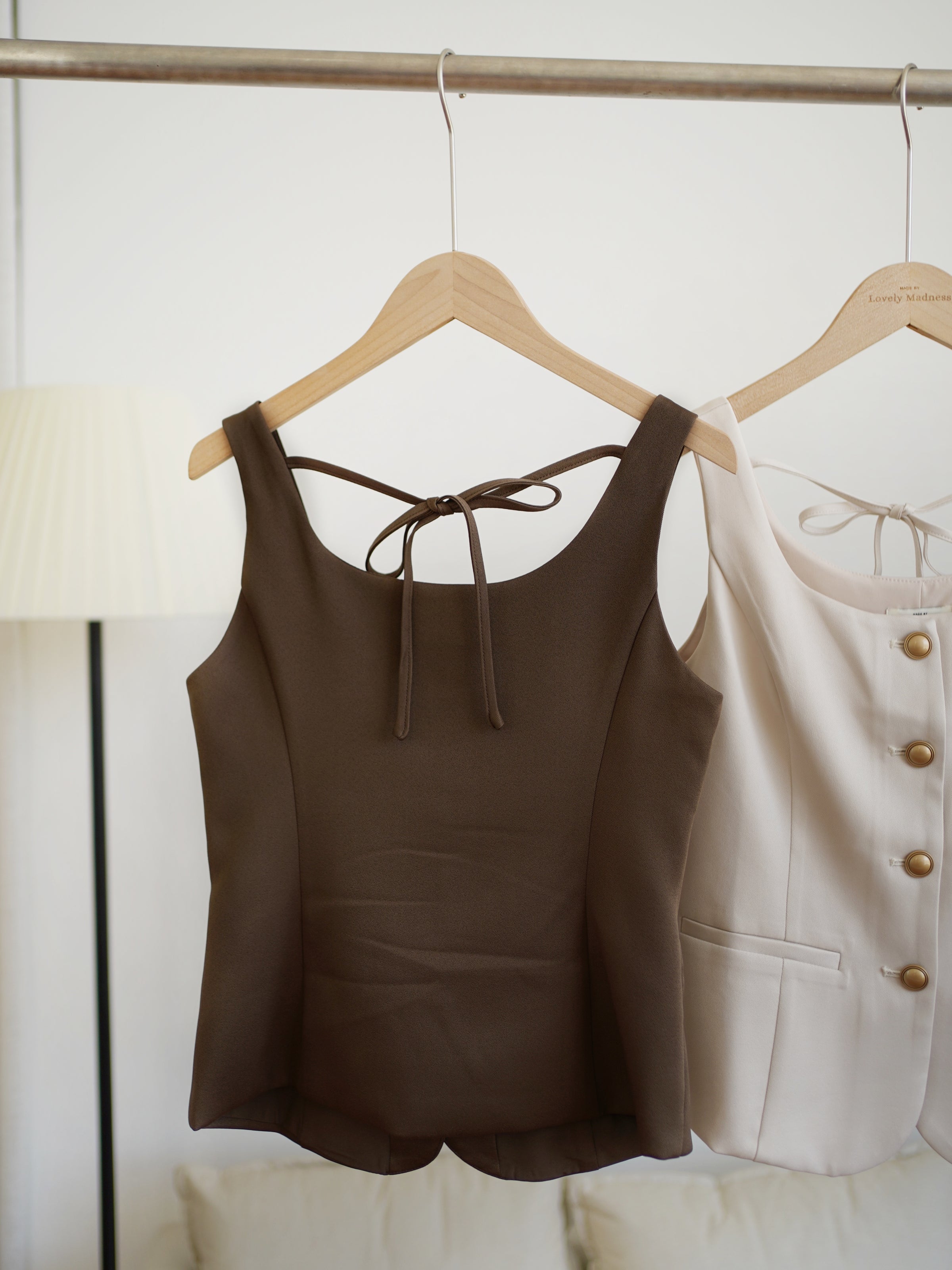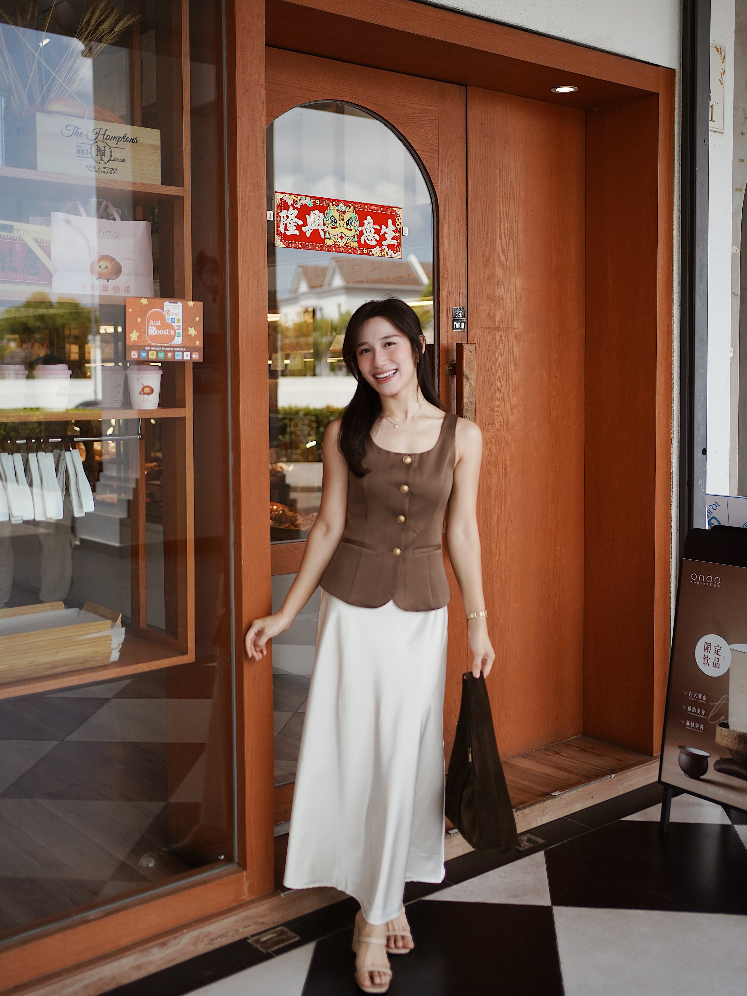 This sweet sleeveless top charms with its square neckline and flattering, structured fit that gently highlights your waist. The gold buttons add a touch of elegance and shine, while the subtle pocket details make it even more stylish. Available in classic black and soft ivory, it’s a versatile piece that pairs beautifully with shorts, jeans, or skirts—perfect for creating effortless everyday looks with a hint of sweetness. 🌸