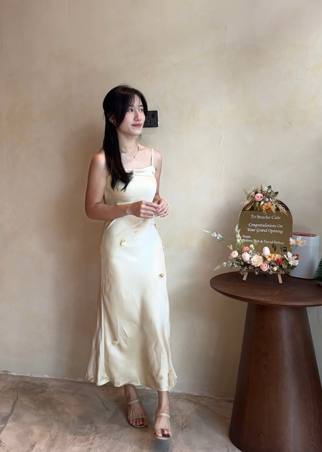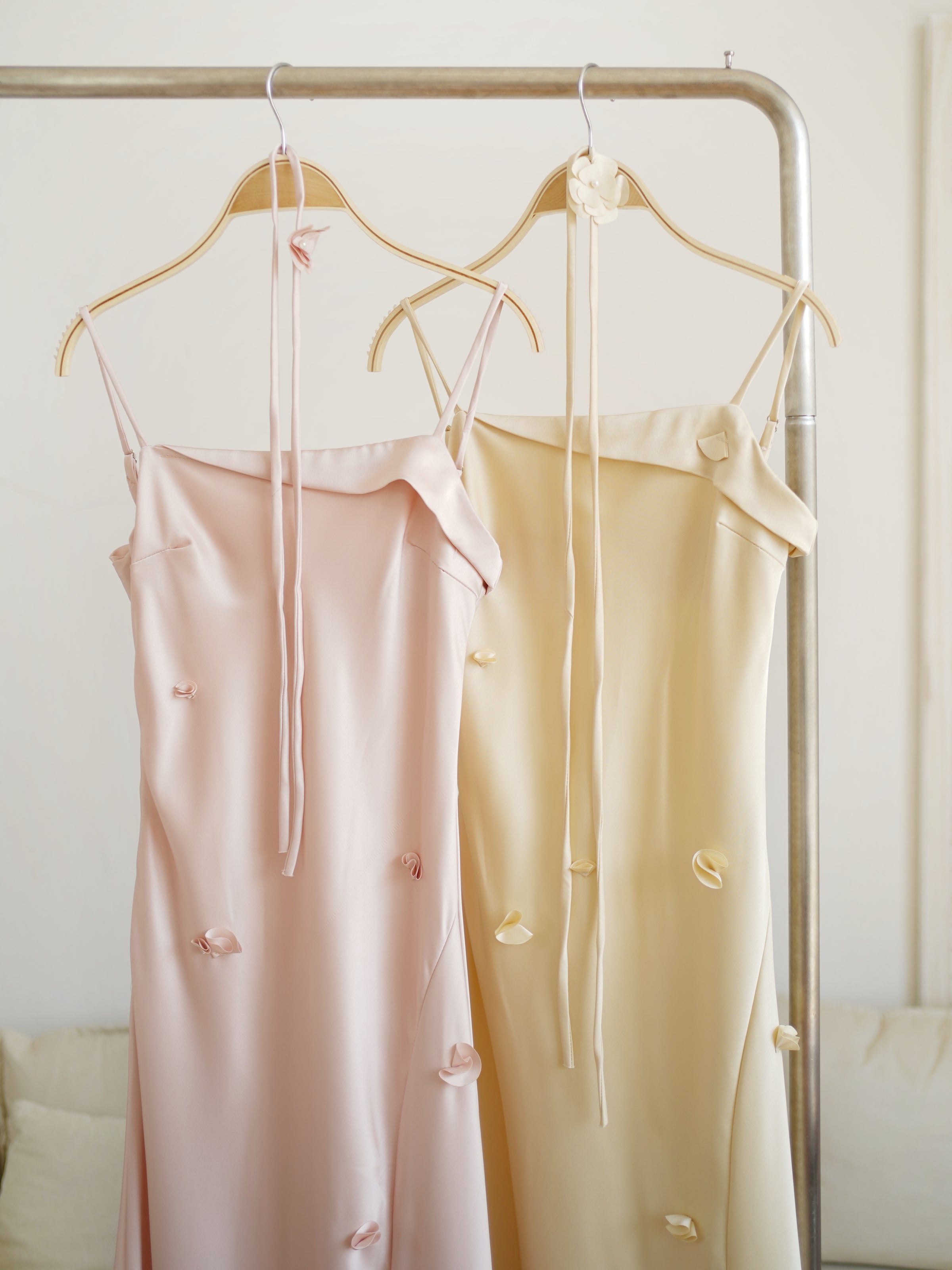 Elevate your wardrobe with this dreamy satin slip dress — a soft, buttery-cream beauty that drapes effortlessly and glows with every step. Featuring delicate spaghetti straps, a fluid silhouette, and chic petal-like appliqués, it blends elegance with a playful, modern twist. Perfect for dates, events, or anywhere you want to feel irresistibly feminine. A must-have piece that makes confidence look effortless. ✨