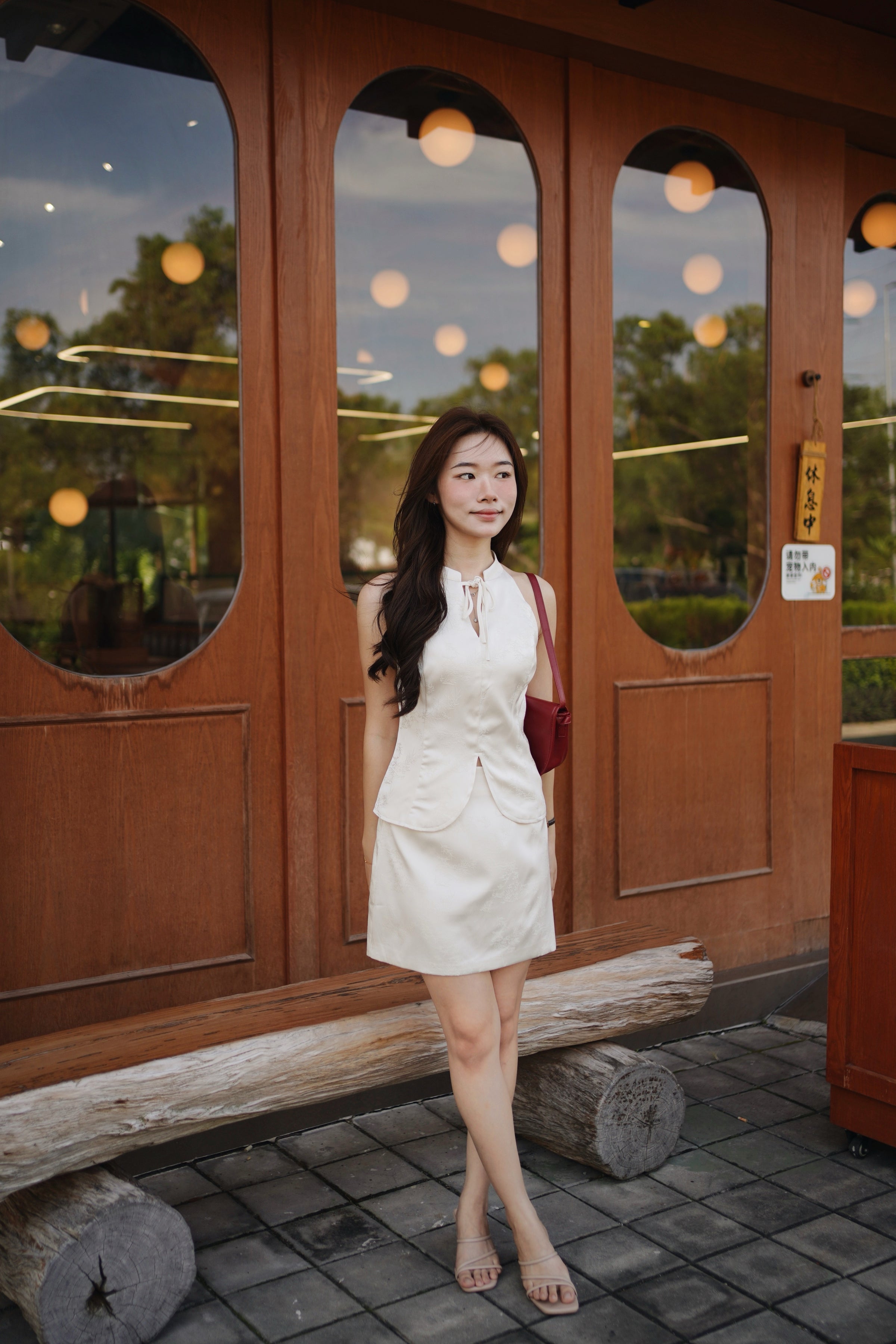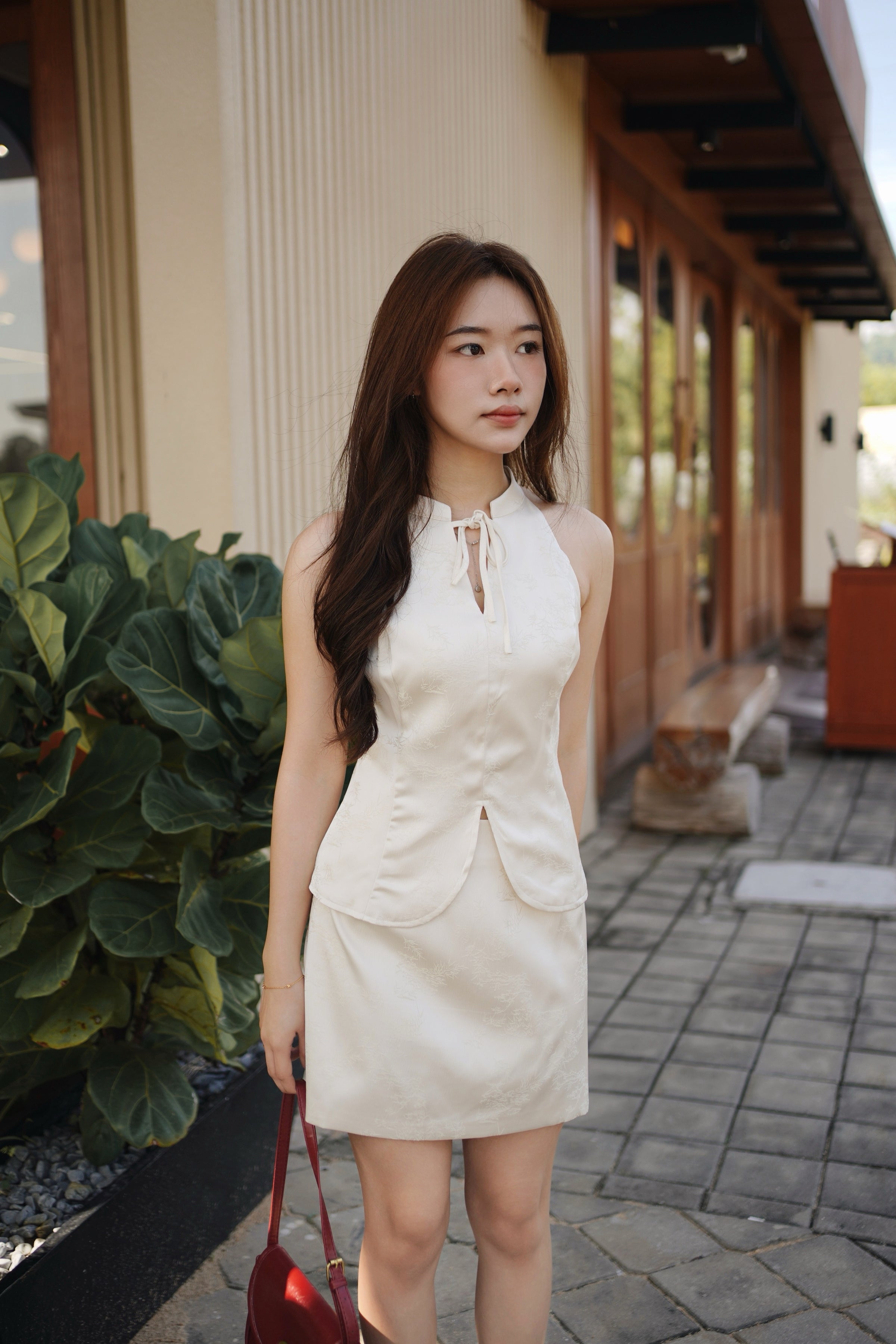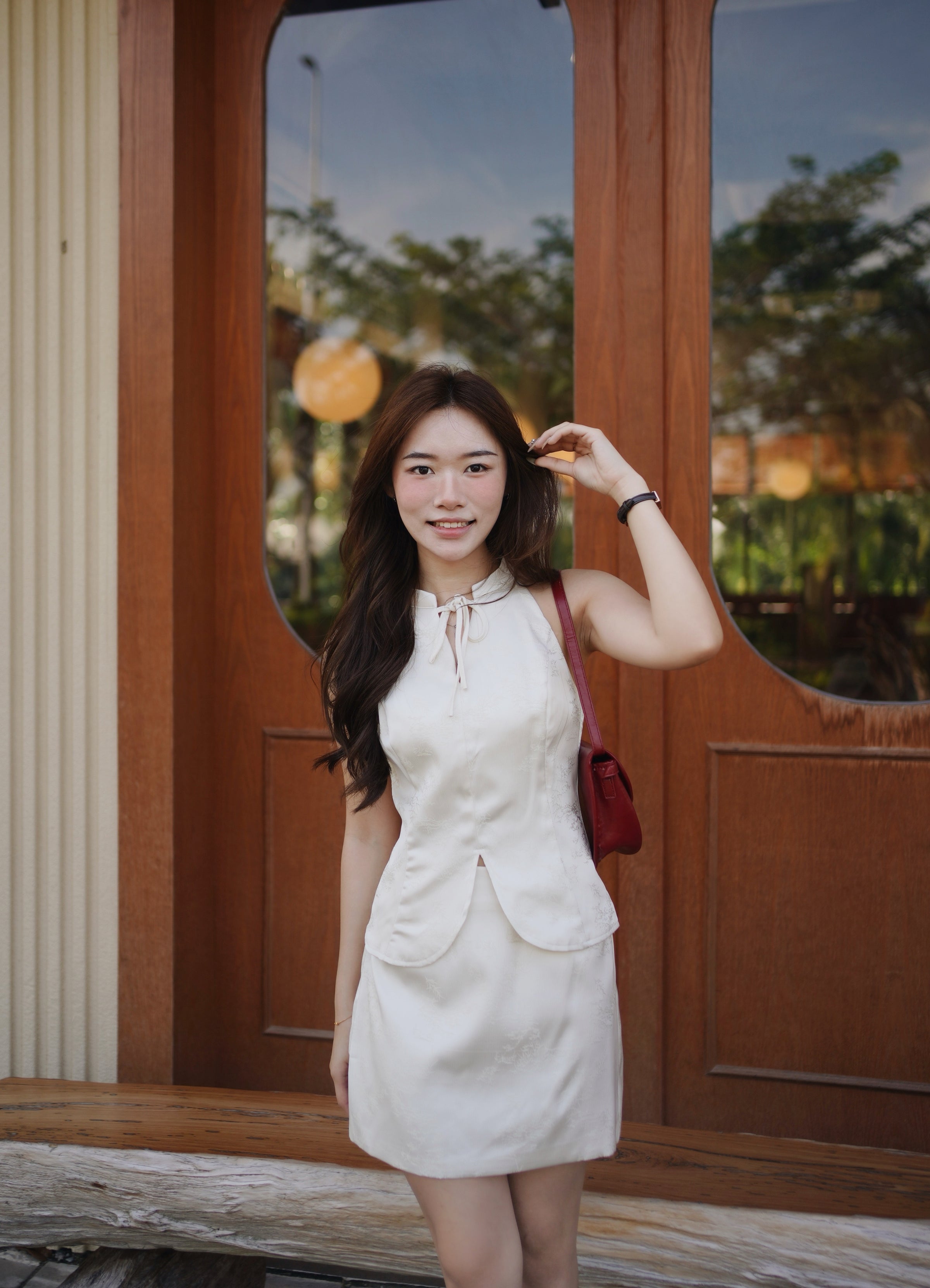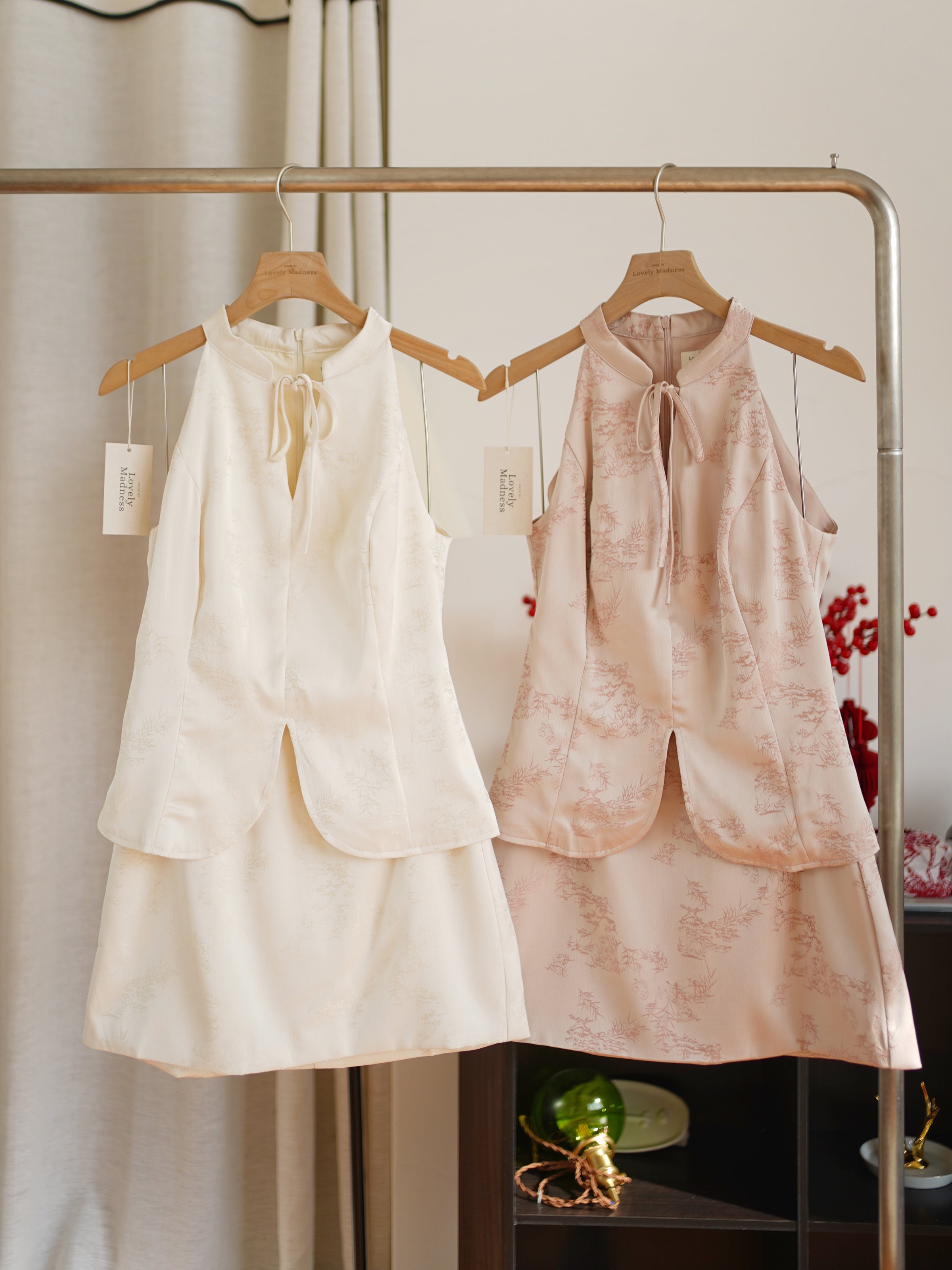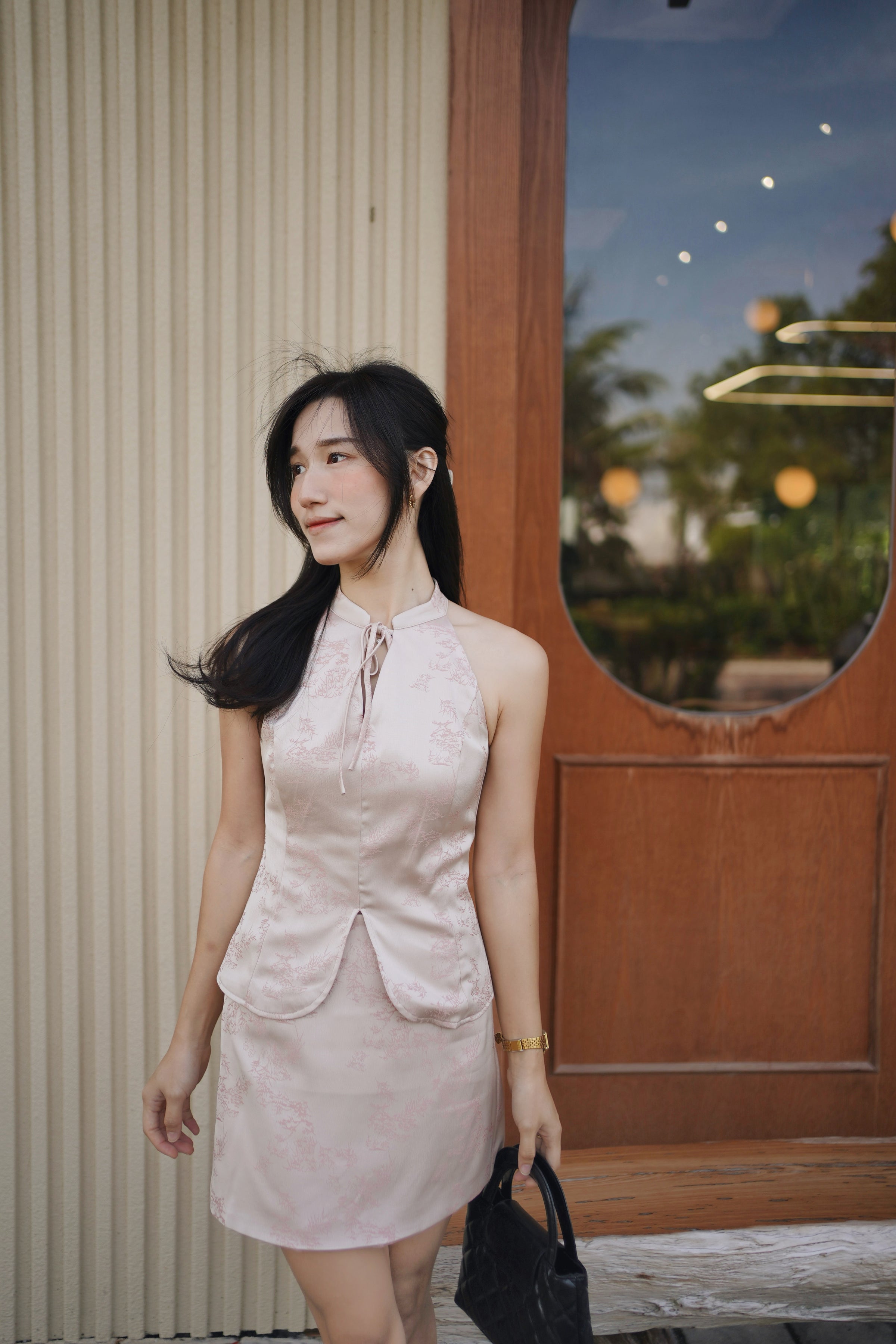 Rou En Set is a refined two-piece ensemble inspired by modern cheongsam elegance. Featuring a sleeveless mandarin-collar top with delicate floral texture and a matching mini skirt, this set flatters the silhouette with a soft, feminine structure. Elegant yet daring, Rou En is perfect for festive occasions, date nights, or elevated everyday wear—timeless charm with a confident modern twist.