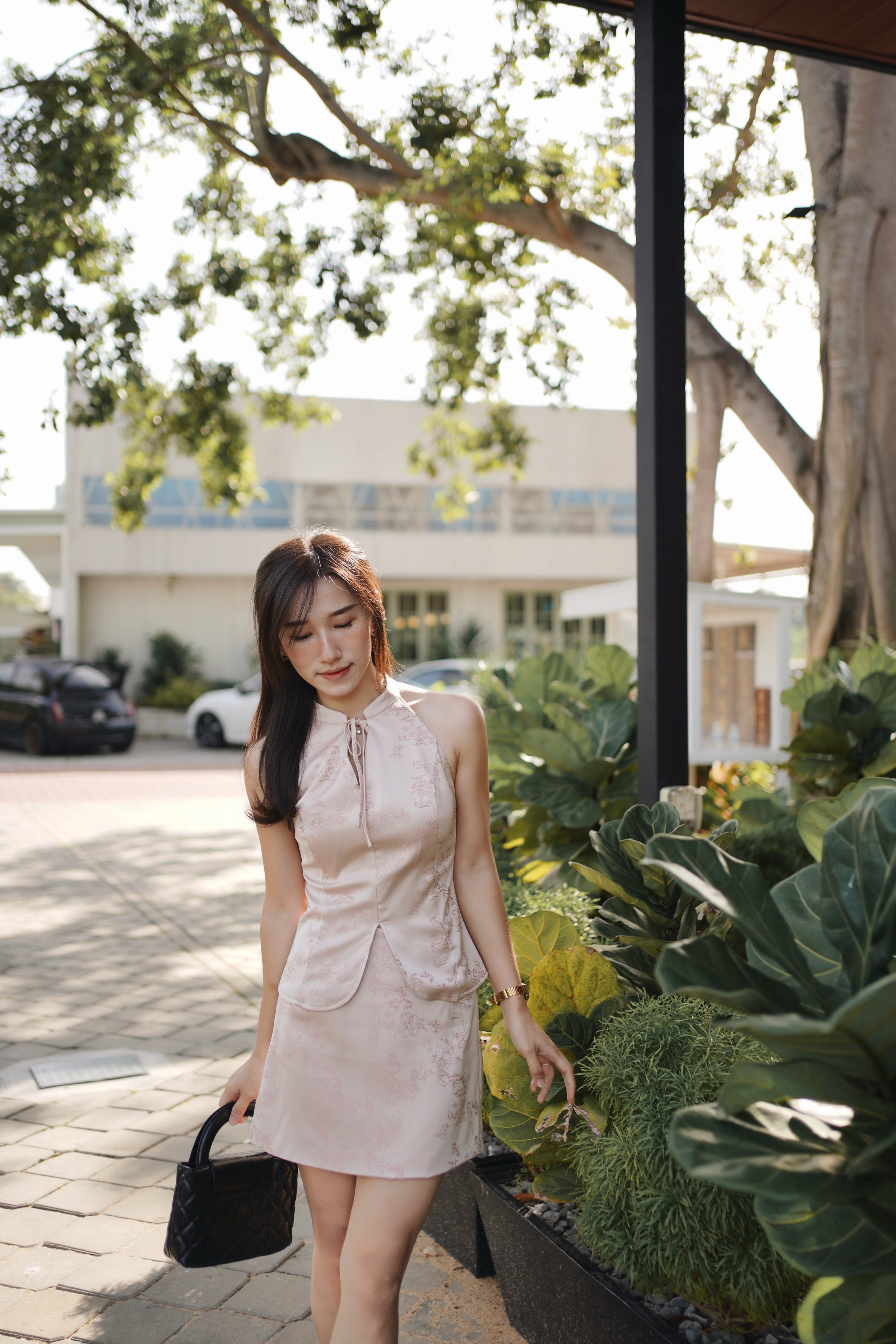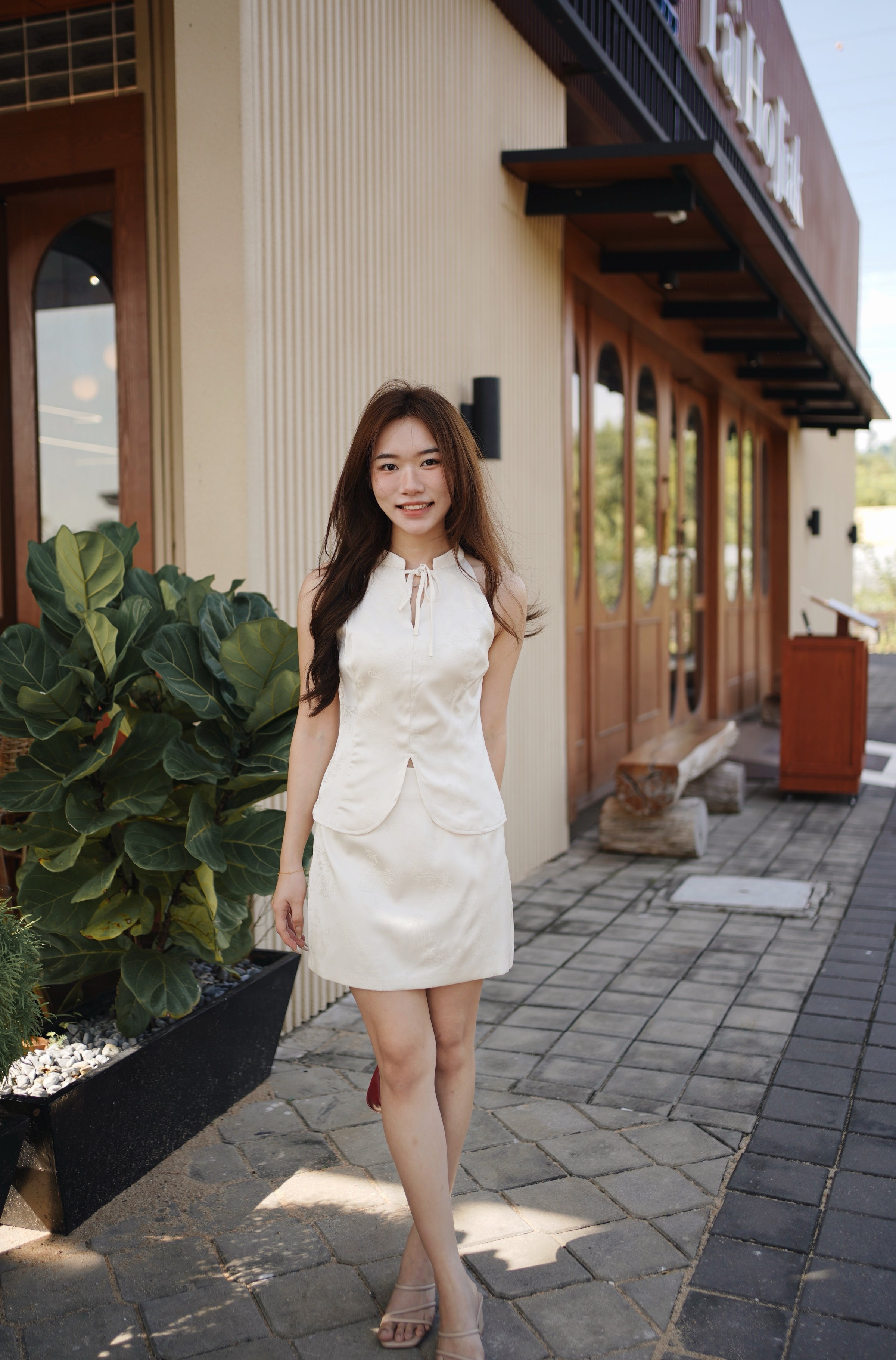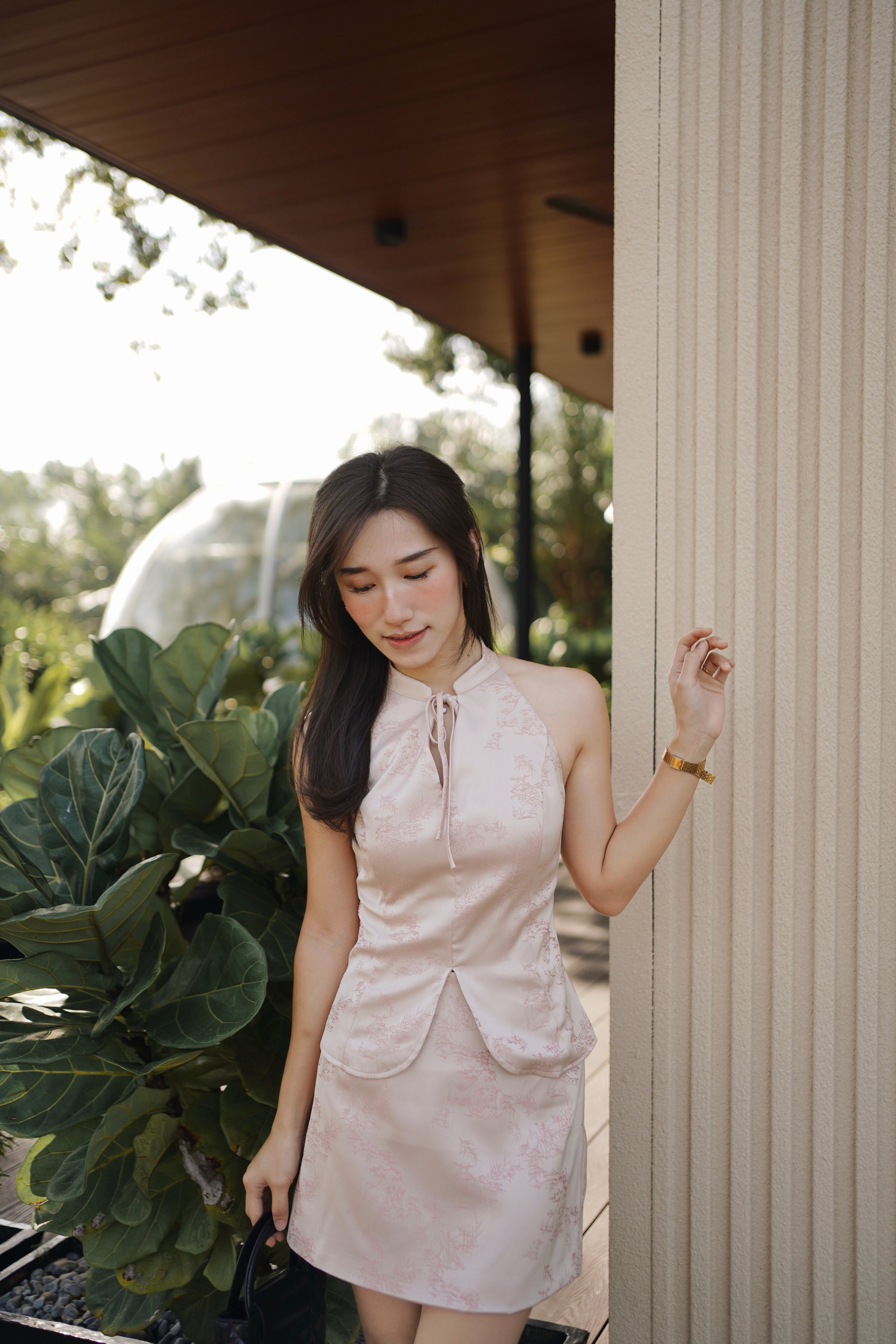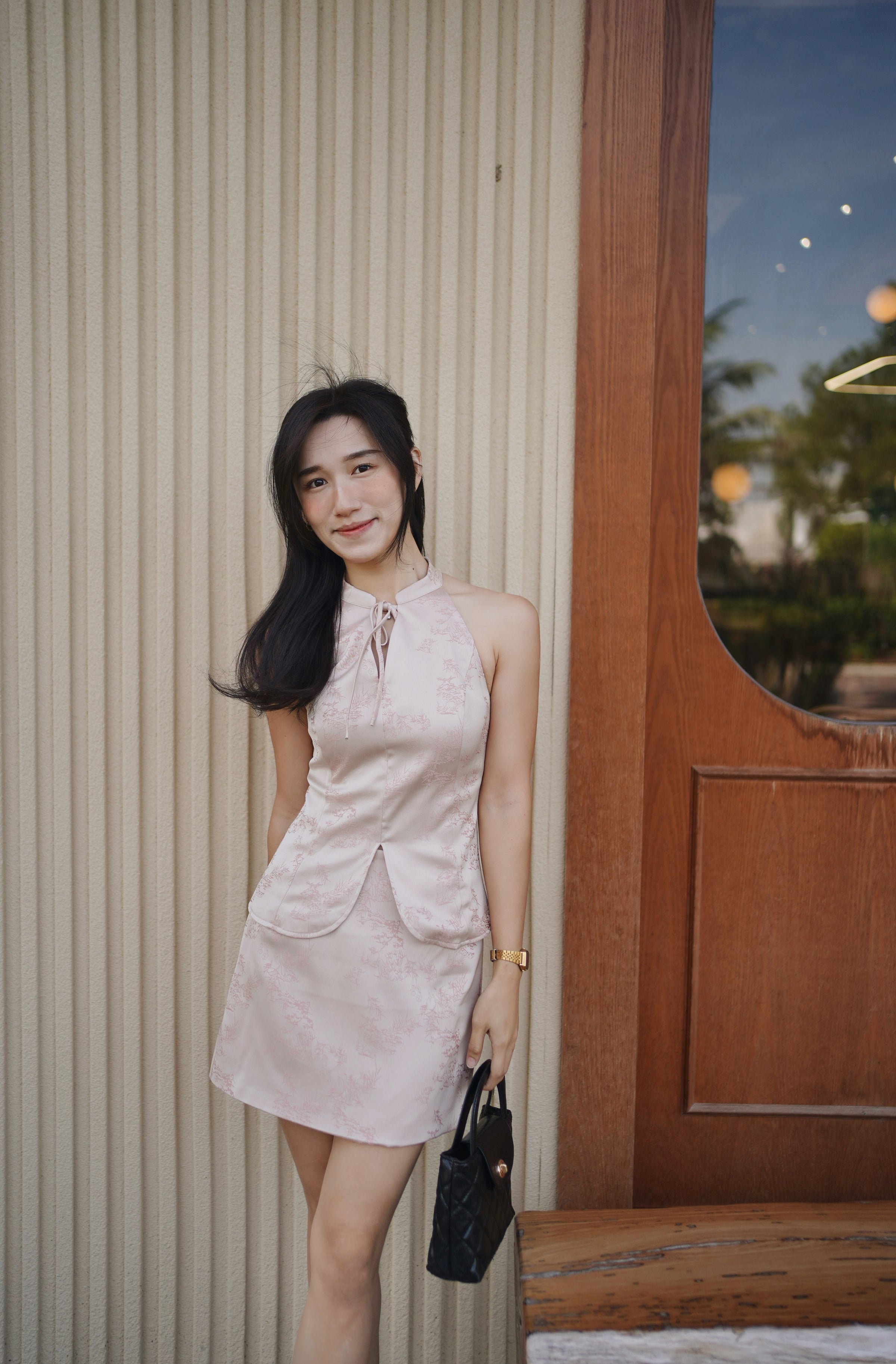 Rou En Set is a refined two-piece ensemble inspired by modern cheongsam elegance. Featuring a sleeveless mandarin-collar top with delicate floral texture and a matching mini skirt, this set flatters the silhouette with a soft, feminine structure. Elegant yet daring, Rou En is perfect for festive occasions, date nights, or elevated everyday wear—timeless charm with a confident modern twist.