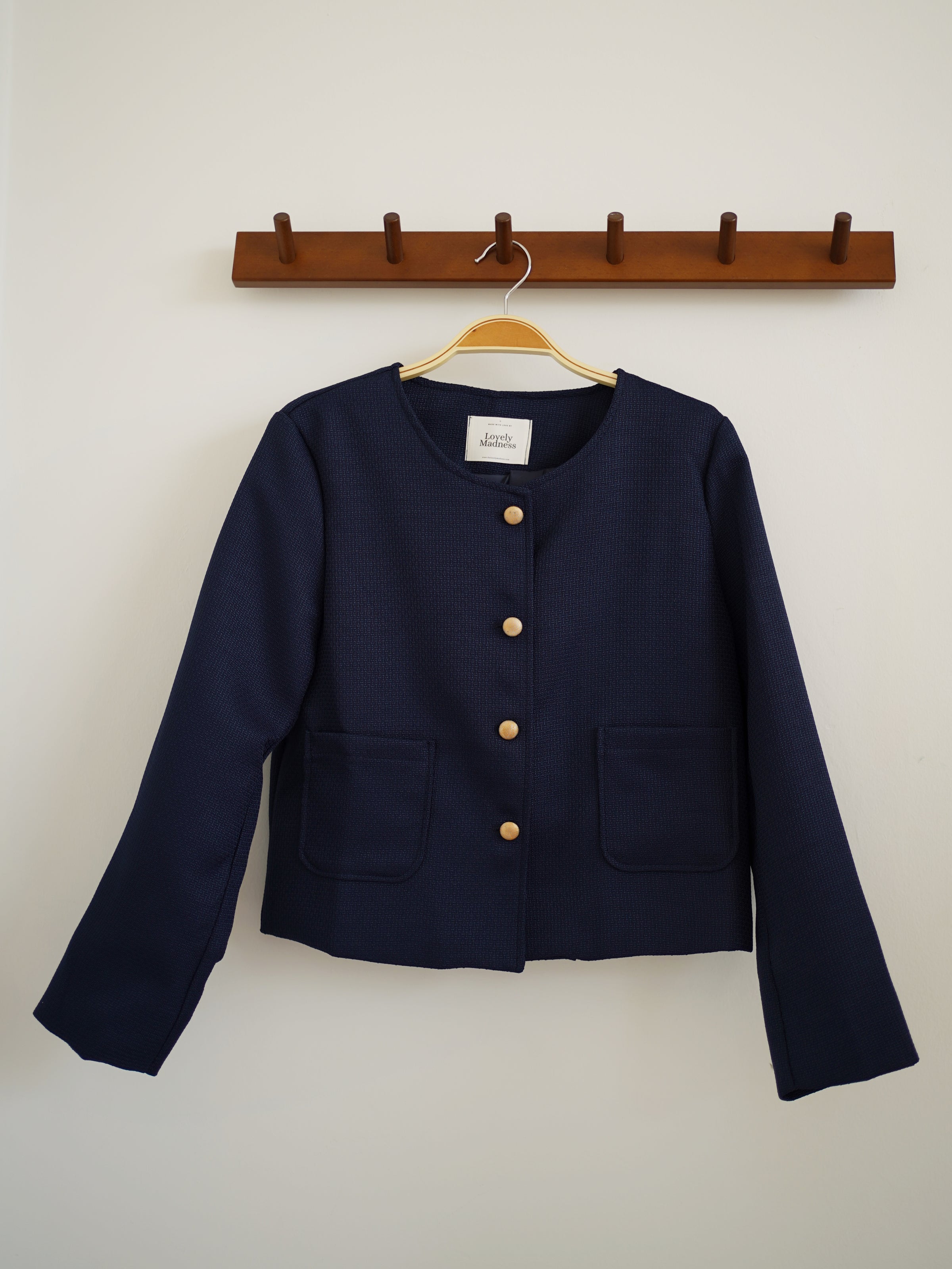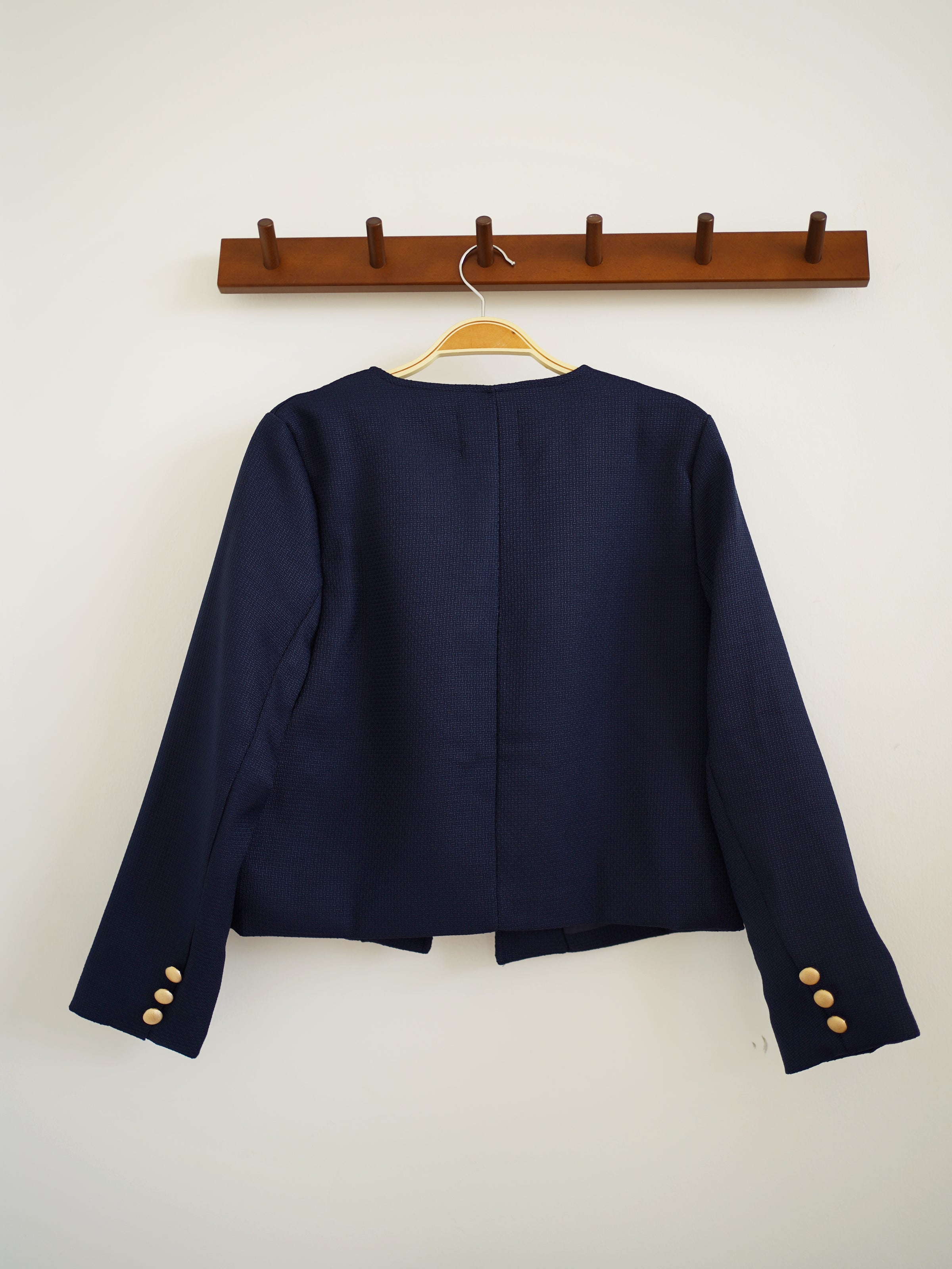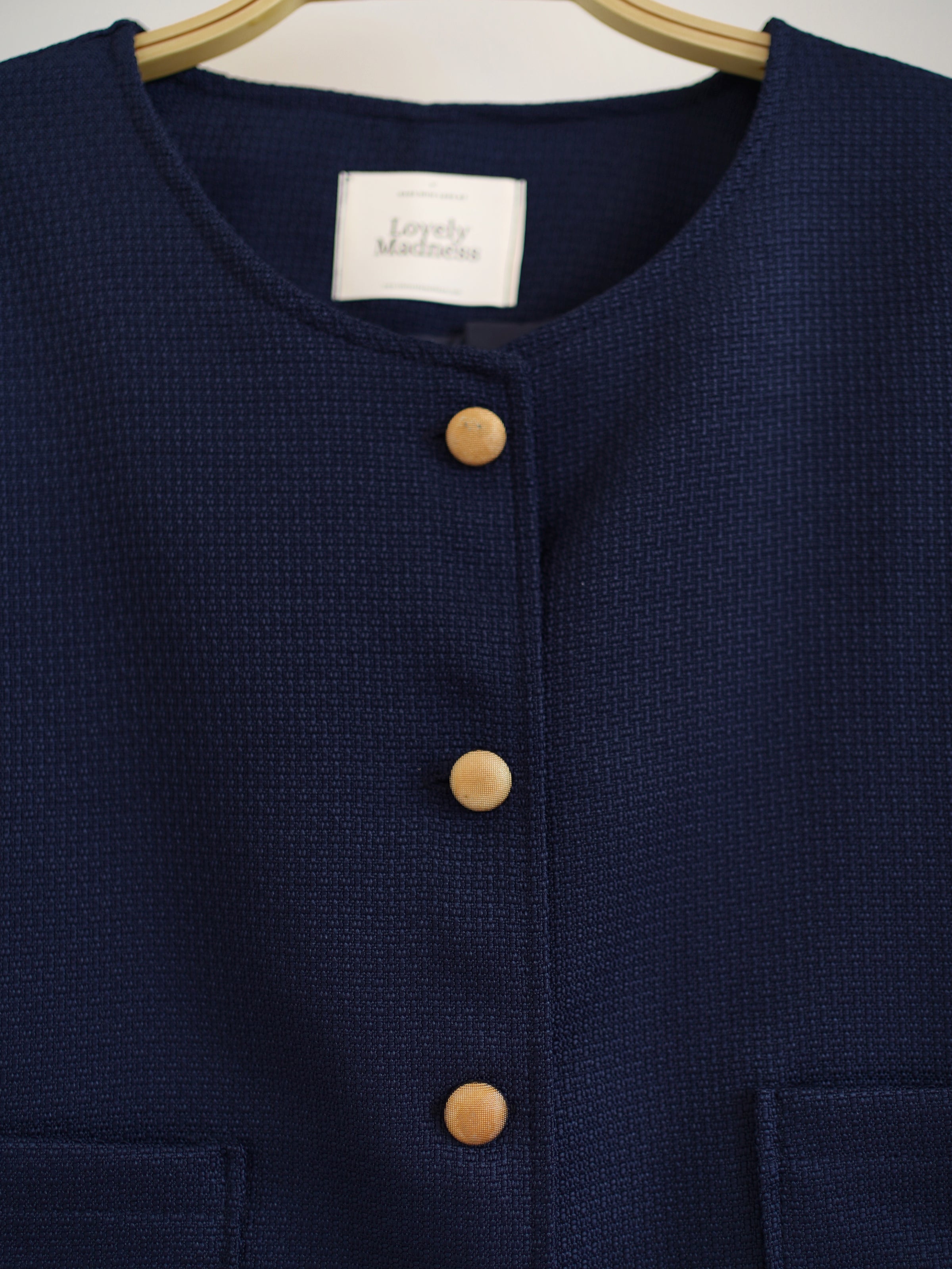 “Elevate any outfit with this chic navy cropped blazer — a timeless piece with modern charm. Featuring gold statement buttons and a clean, collarless cut, it adds instant polish while keeping the look soft and feminine. Perfect for work, dates, or smart-casual days, this versatile blazer makes you look effortlessly elegant with zero effort.”