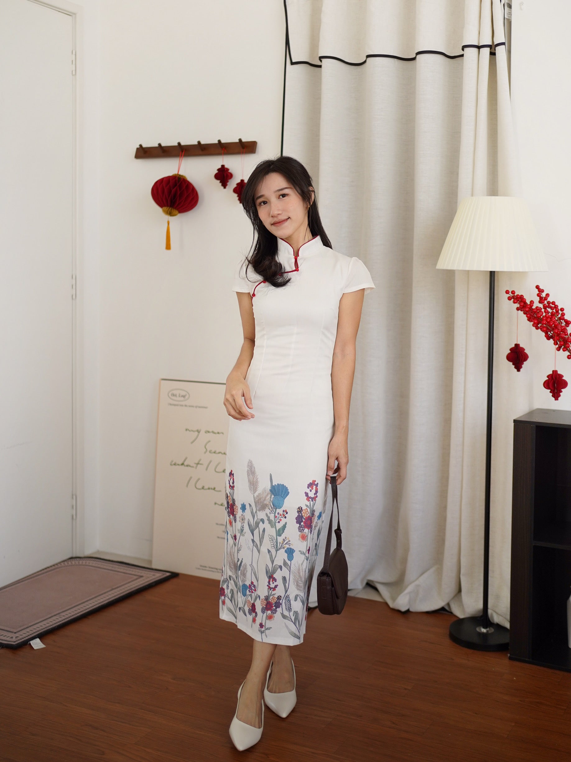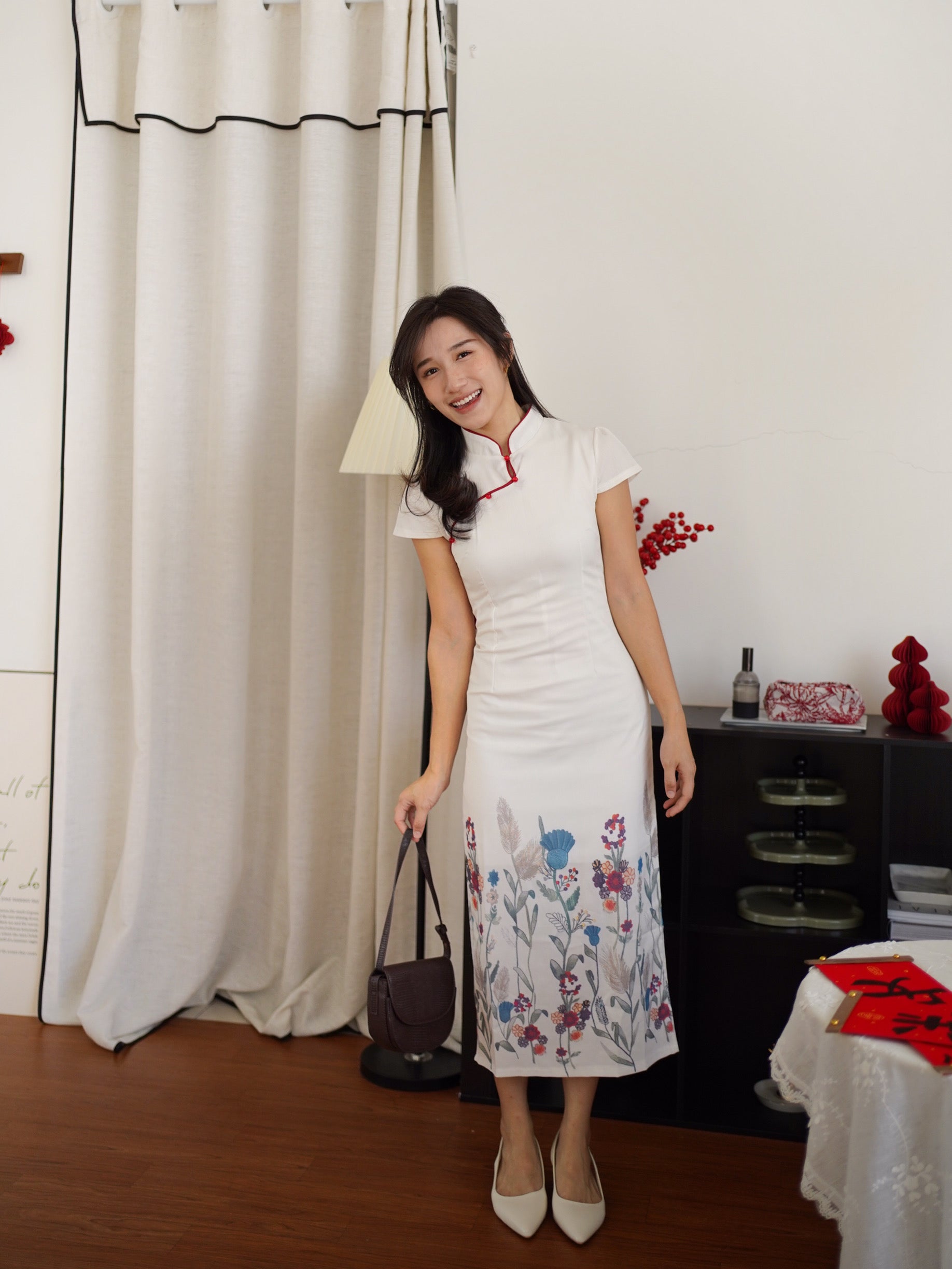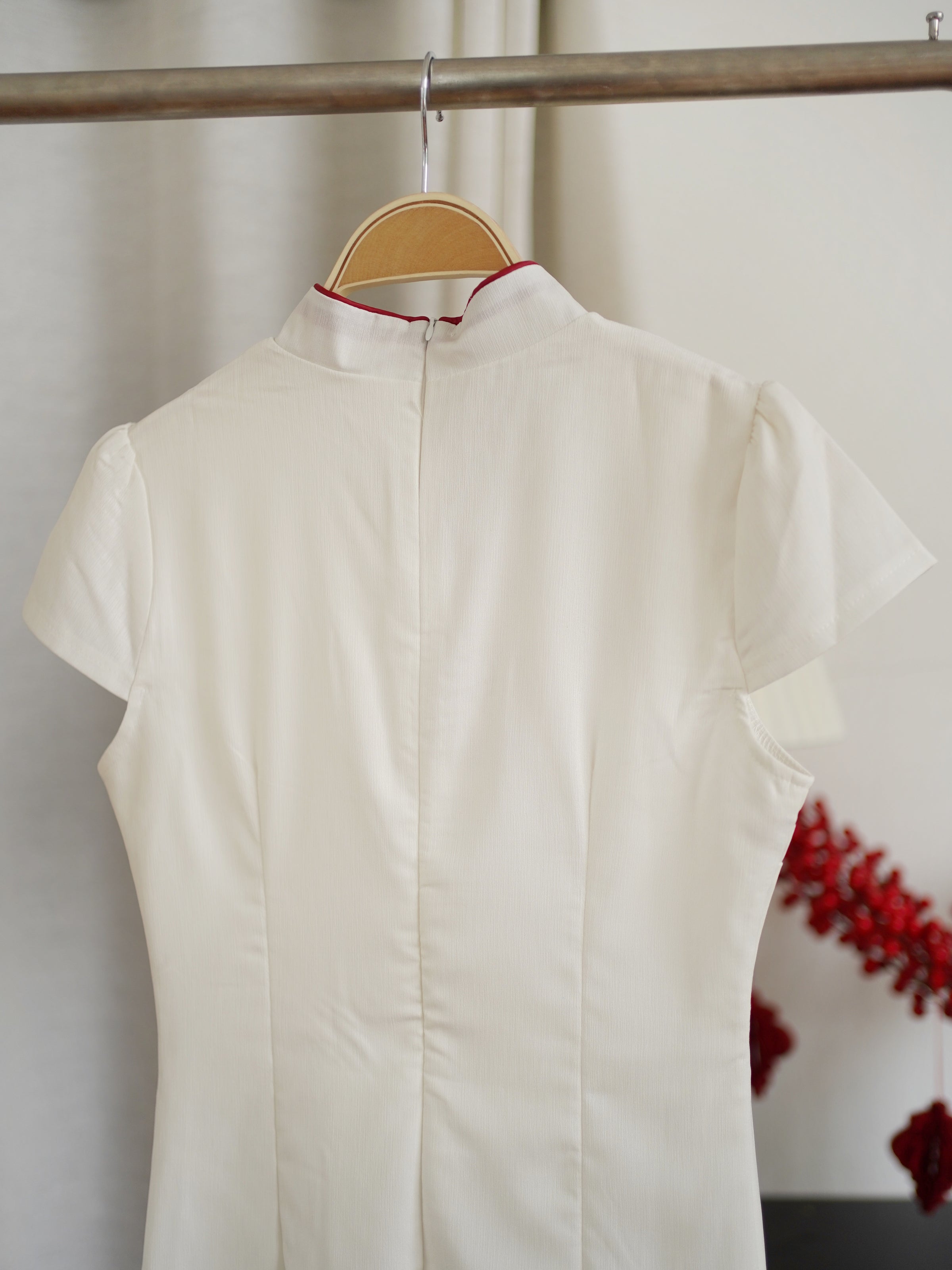 This elegant cheongsam-inspired dress blends timeless oriental design with modern minimalism. Crafted in a soft ivory tone, it features a classic mandarin collar with delicate red piping and traditional frog-button detailing along the neckline, adding a refined cultural touch.