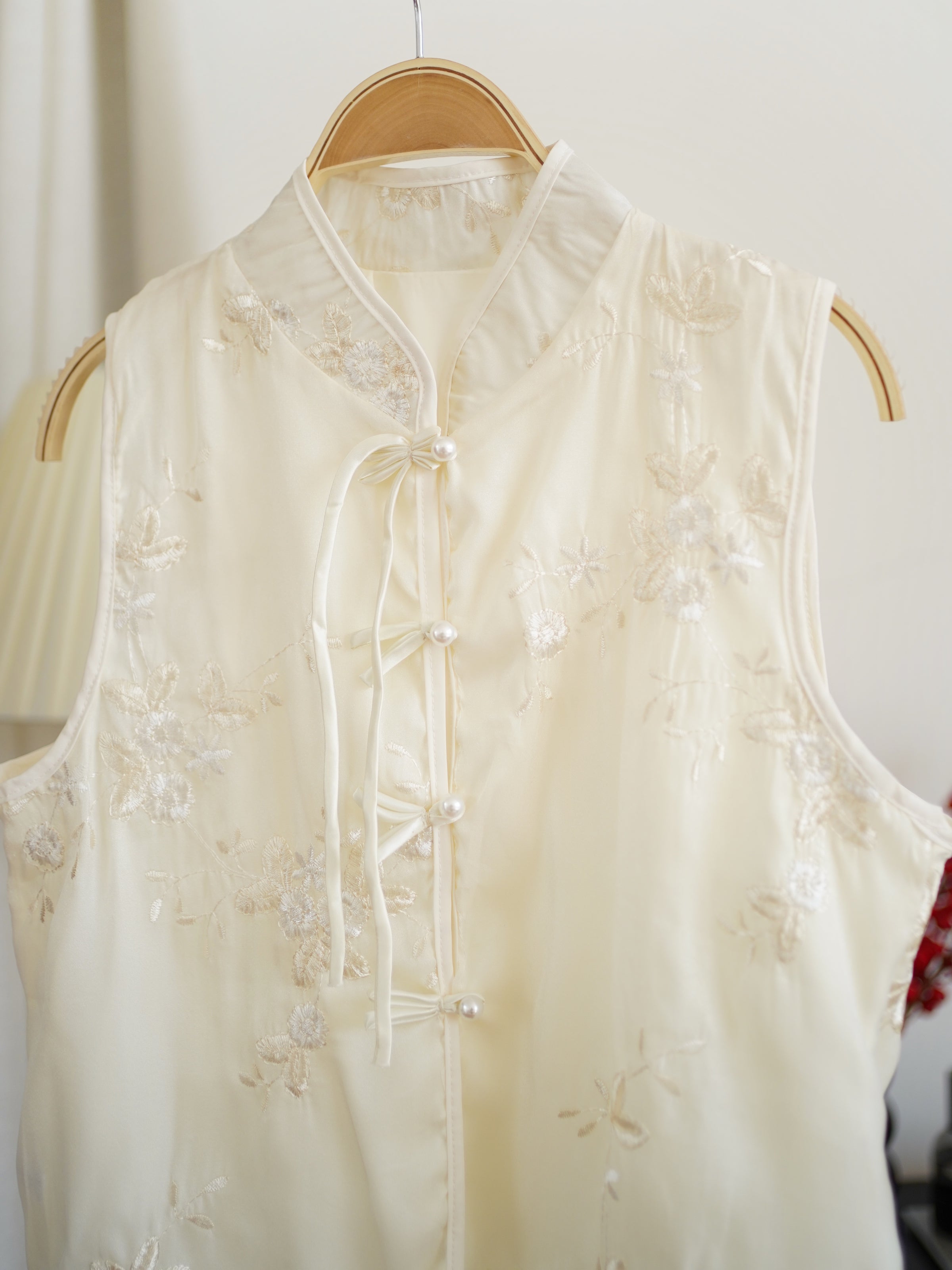 Elevate your wardrobe with this elegant sleeveless mandarin collar top, crafted from lightweight sheer fabric with delicate floral embroidery throughout. Featuring a traditional Chinese-inspired knot button closure with pearl accents, this top blends timeless oriental charm with modern femininity. The soft ivory tone and subtle translucence create an airy, graceful look, perfect for warm-weather styling.