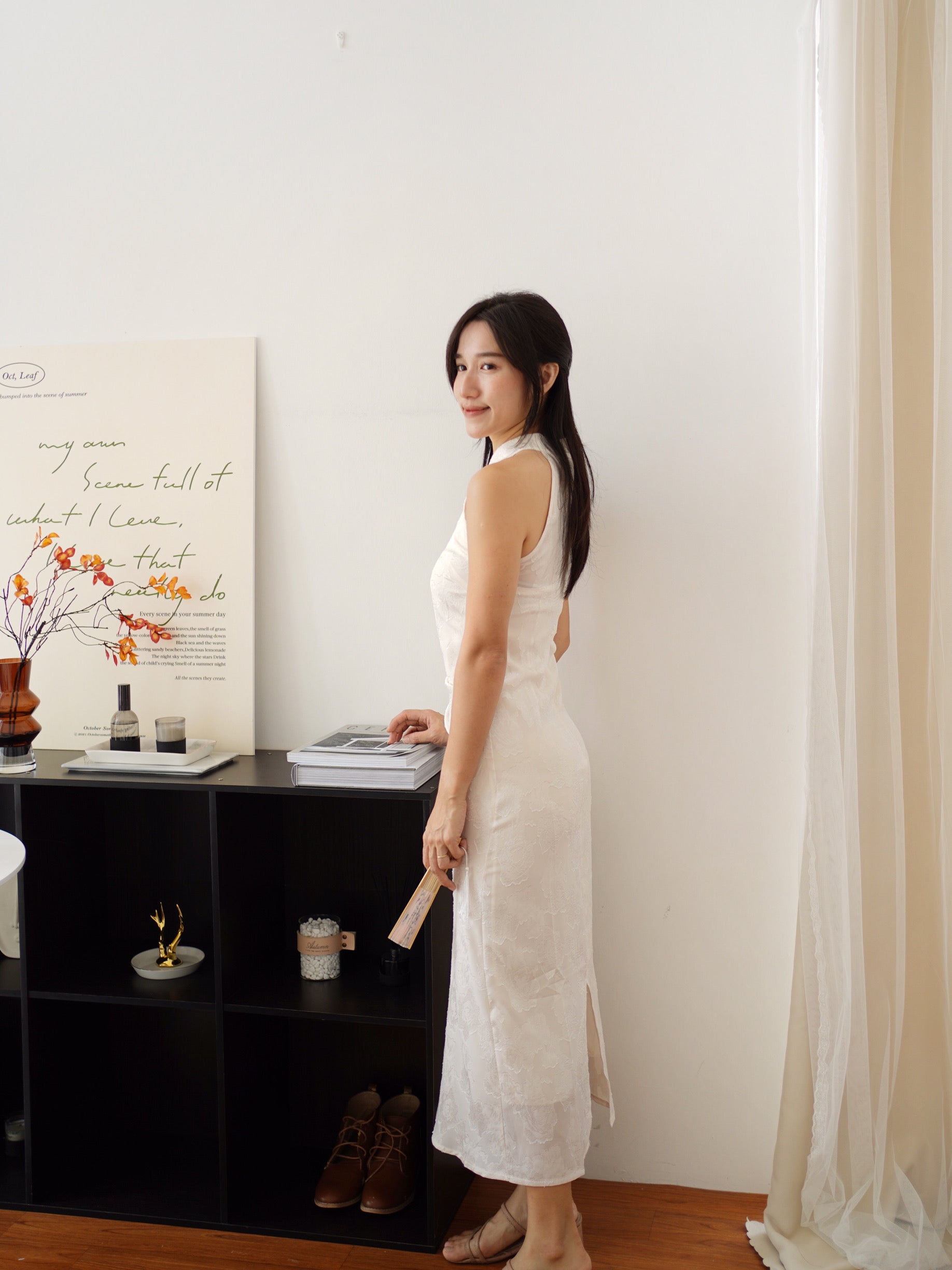 This elegant halter cheongsam dress is the perfect blend of modern chic and timeless charm. Designed with a soft ivory jacquard fabric that subtly shimmers, it hugs your silhouette beautifully while keeping things classy and feminine. The high-neck bow detail and keyhole cut add a flirty touch without being too much—ideal for special dinners, festive events, or romantic dates. A dress that makes you feel graceful, confident, and effortlessly stunning. ✨